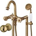 Назначение: ванна+душ • Конструкция: однорычажный • Монтаж: горизонтальный • Клапан: керамический • Материал: латунь, покрытие - бронза • Подводка: жесткая • Монтажные отверстия: 2 отверстия • Форма излива: традиционная • Душевая лейка в комплекте: есть • Держатель для душевой лейки: на смесителе • Аэратор: есть • Донный клапан в комплекте: есть