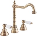 Назначение: для умывальника • Конструкция: двухрычажный • Монтаж: вертикальный • Клапан: керамический • Материал: латунь, покрытие - бронза • Подводка: жесткая • Монтажные отверстия: 3 отверстия • Форма излива: традиционная • Душевая лейка в комплекте: нет • Аэратор: есть • Донный клапан в комплекте: есть