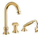 Назначение: ванна+душ • Конструкция: двухрычажный • Монтаж: горизонтальный • Клапан: керамический • Материал: латунь, покрытие - золото • Подводка: гибкая • Монтажные отверстия: 5 отверстий • Форма излива: традиционная • Душевая лейка в комплекте: есть • Аэратор: есть
