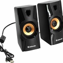 Звуковая схема: 2.0 • Суммарная мощность (RMS): 8 Вт • Материал корпуса колонок: пластик • Частотный диапазон: 70 Гц - 20 КГц • Линейный вход: стерео (mini-jack 3.5мм) • Пульт управления: проводной • Количество полос фронтальных колонок: 1 • Питание: от порта USB • Цвет: черный